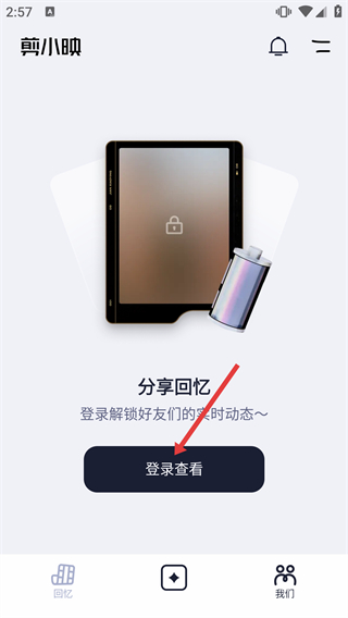 2、在剪小映的【我們】頁(yè)面,點(diǎn)擊【登錄查看】按鈕,可進(jìn)入登錄流程以解鎖分享回憶等功能。