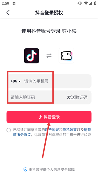 4、在【抖音登錄授權(quán)】頁(yè)面,填寫對(duì)應(yīng)手機(jī)號(hào)并獲取驗(yàn)證碼后,勾選相關(guān)協(xié)議,點(diǎn)擊【抖音登錄】按鈕完成登錄授權(quán)。
