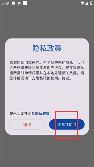 1、閱讀【隱私政策】后勾選“我已閱讀并同意隱私政策”,點擊【同意并使用】即可進入軟件。