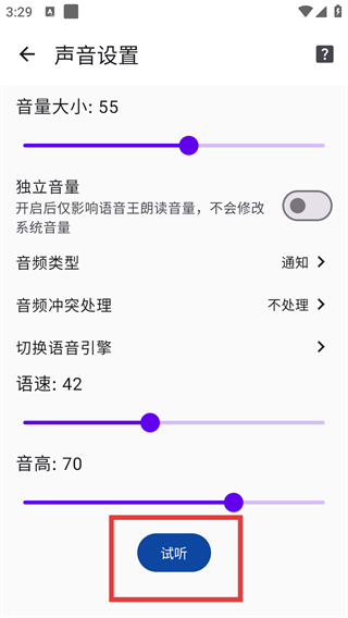 4、在【聲音設置】頁面可調整音量、語速等參數(shù),點擊【試聽】可預覽效果。