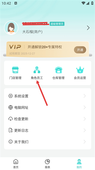 1、進(jìn)入【我的】頁(yè)面,查看【大石榴(商戶)】信息,找到【角色員工】選項(xiàng),同時(shí)可查看【門店管理】等功能入口并點(diǎn)擊。