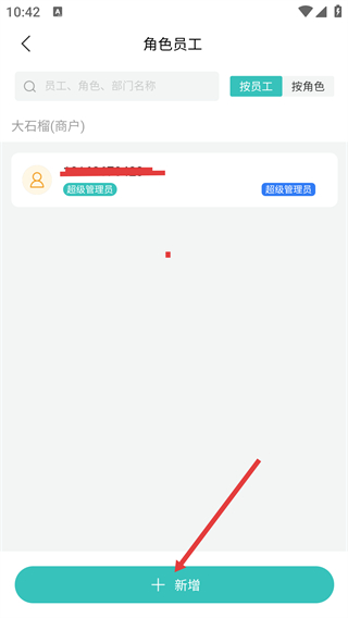2、進(jìn)入【角色員工】頁(yè)面,查看現(xiàn)有【超級(jí)管理員】角色信息后,點(diǎn)擊底部【新增】按鈕,準(zhǔn)備添加新角色或員工。