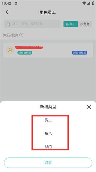 3、點(diǎn)擊【新增】后彈出【新增類型】彈窗,可選擇【員工-角色-部門】中的對(duì)應(yīng)類型,按需選擇以推進(jìn)操作。