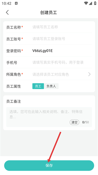 4、進(jìn)入【創(chuàng)建員工】頁(yè)面,填寫帶*的【員工名稱-員工賬號(hào)】等信息,選好【所屬角色】后點(diǎn)擊【保存】完成創(chuàng)建。