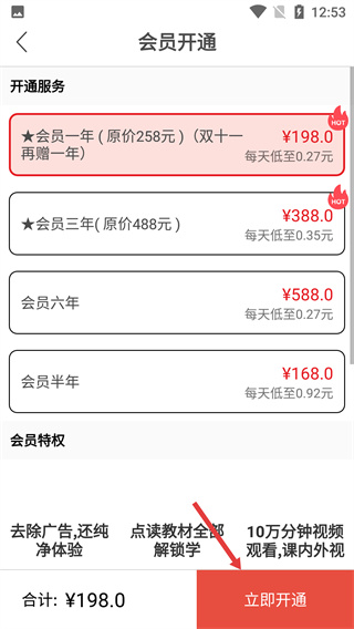 3、在會(huì)員開通頁面選擇目標(biāo)套餐,點(diǎn)擊【立即開通】按鈕進(jìn)入支付環(huán)節(jié)。