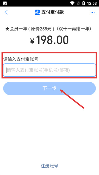 4、在支付寶付款頁面,輸入對(duì)應(yīng)的支付寶賬號(hào),點(diǎn)擊【下一步】按鈕,繼續(xù)完成會(huì)員開通的支付流程。