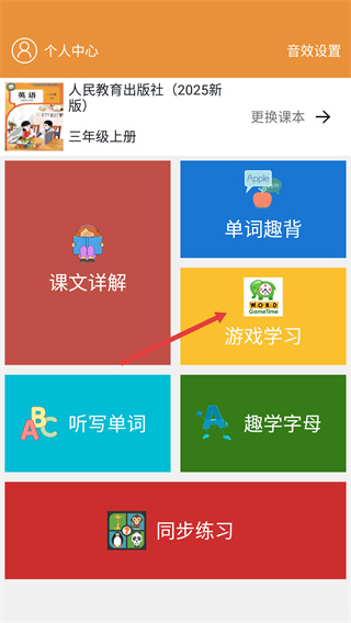 1、進(jìn)入三年級(jí)上冊(cè)英語(yǔ)課程頁(yè)面,找到【游戲?qū)W習(xí)】功能選項(xiàng)并點(diǎn)擊,進(jìn)入游戲?qū)W習(xí)的選擇界面。