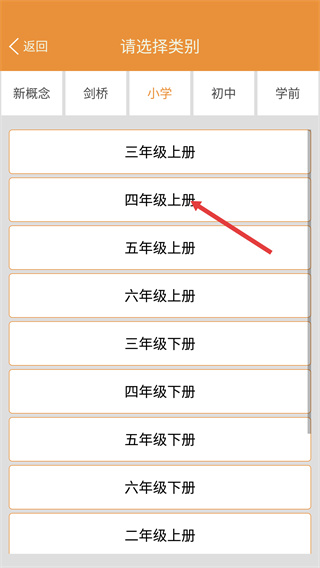 2、在類(lèi)別選擇界面,選擇“小學(xué)”分類(lèi)下的【四年級(jí)上冊(cè)】選項(xiàng),進(jìn)入對(duì)應(yīng)年級(jí)的教材版本選擇頁(yè)面。