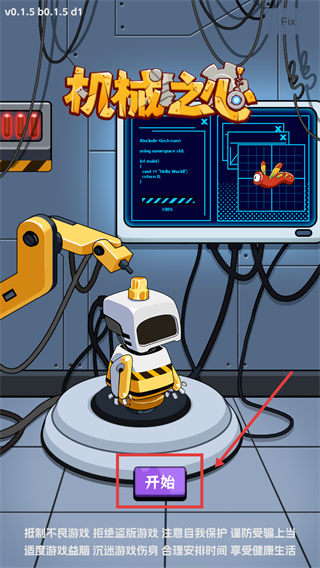 1、進(jìn)入【機(jī)械之心】游戲界面后,點(diǎn)擊【開始】按鈕即可進(jìn)入關(guān)卡,界面中的機(jī)器人與代碼元素是玩法核心主題。